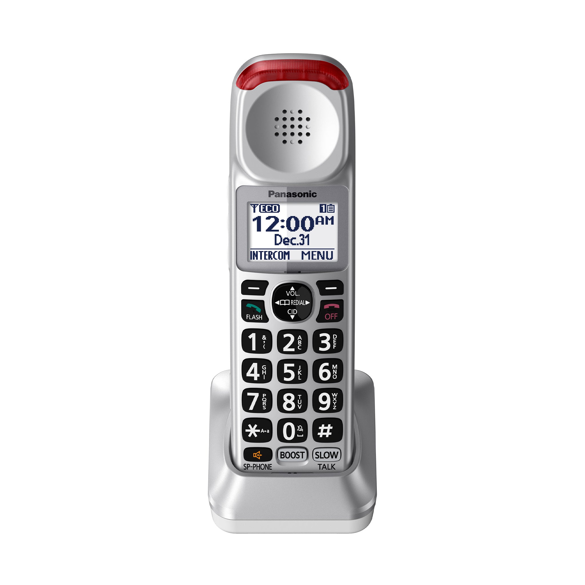 - Gran pantalla LCD retroiluminada blanca, teclas y controles de marcación táctil ampliados, además de timbres visuales LED rojos brillantes en la unidad base del teléfono y el auricular inalámbrico mejoran la visibilidad y la comodidad de las llamadas.
