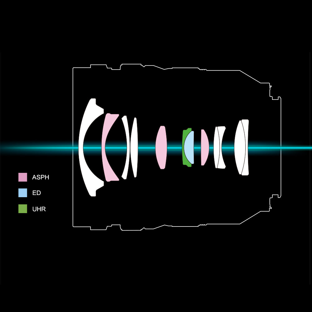 - 12 elementos en 9 grupos, el uso de 3 lentes asféricas, una lente ED (dispersión extra baja) y una lente UHR (índice de refracción ultra alto) con alineación óptima para lograr un alto rendimiento mtf