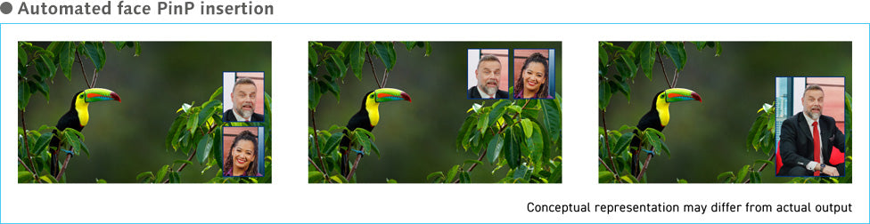 AI Face Crop uses AI-powered face detection to recognize and track specific individuals to automatically insert face PinP (Picture-in-Picture) overlays in real time. A single camera can display multiple face PinP overlays simultaneously eliminating the need for multiple cameras.