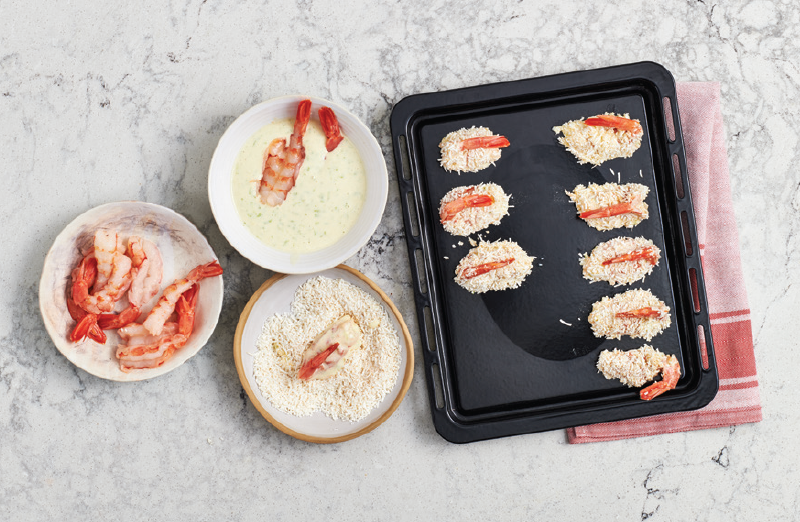 - Tremper les crevettes dans la pâte suivie du mélange de flocons de noix de coco. Placer sur la plaque à pâtisserie, queue vers le haut.