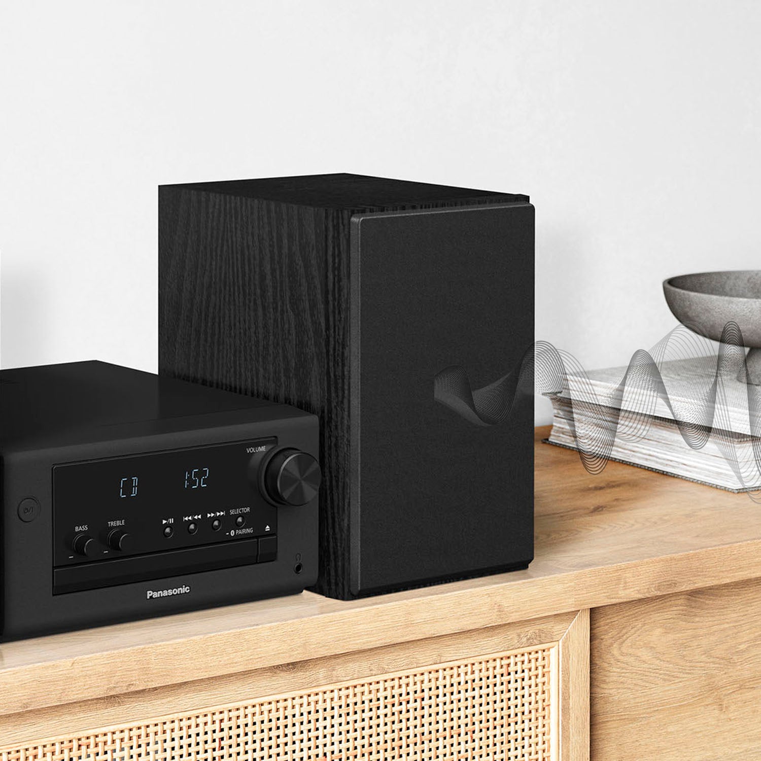 - Sortie RMS de 80 W (40 W + 40 W) pour un son puissant et clair dans un boîtier compact : lecteur CD, radio et lecture Bluetooth® sans fil tout en un, avec haut-parleurs stéréo ; avec woofer de 10 cm et tweeter de 6 cm avec port Bass Reflex