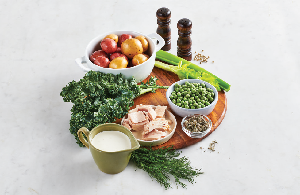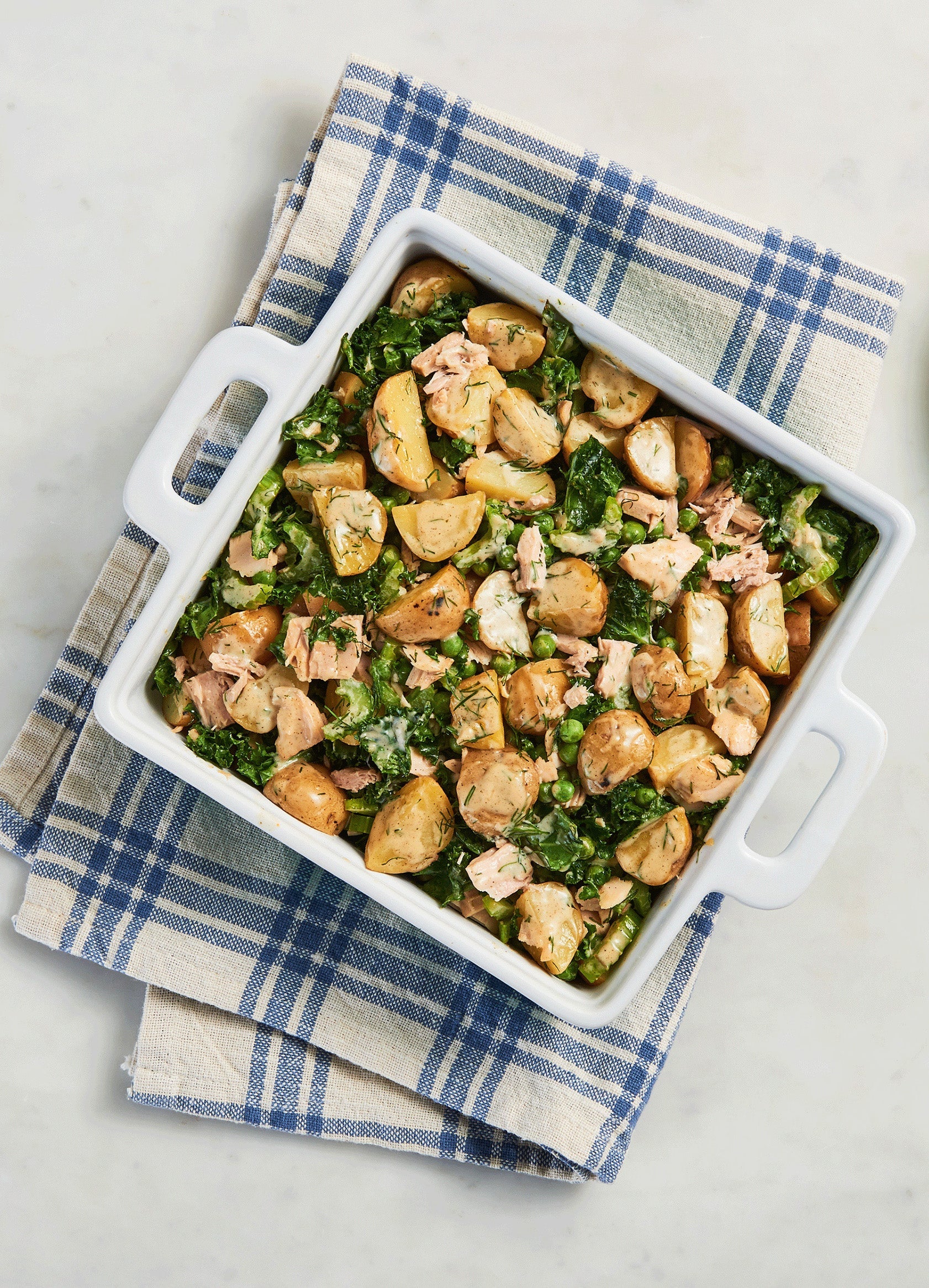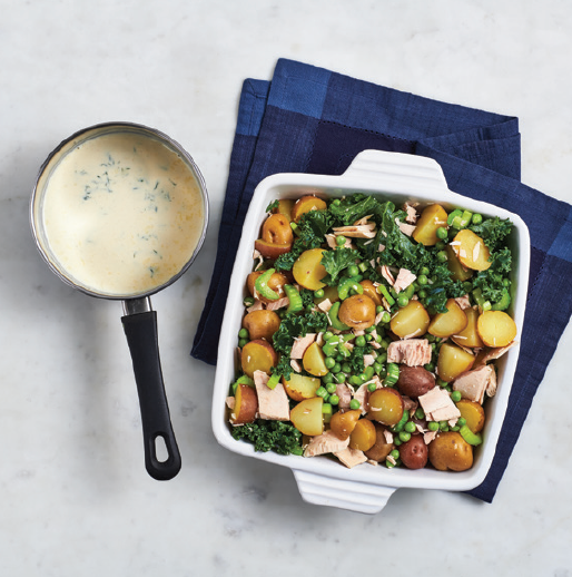 Ce plat simple est une combinaison délicieuse et copieuse de thon, de pommes de terre, de chou frisé, de céleri et de pois, arrosé d'une sauce crémeuse à l'aneth. Les notes acidulées et la garniture chaleureuse en feront un ajout parfait à votre prochain repas-partage d’été !