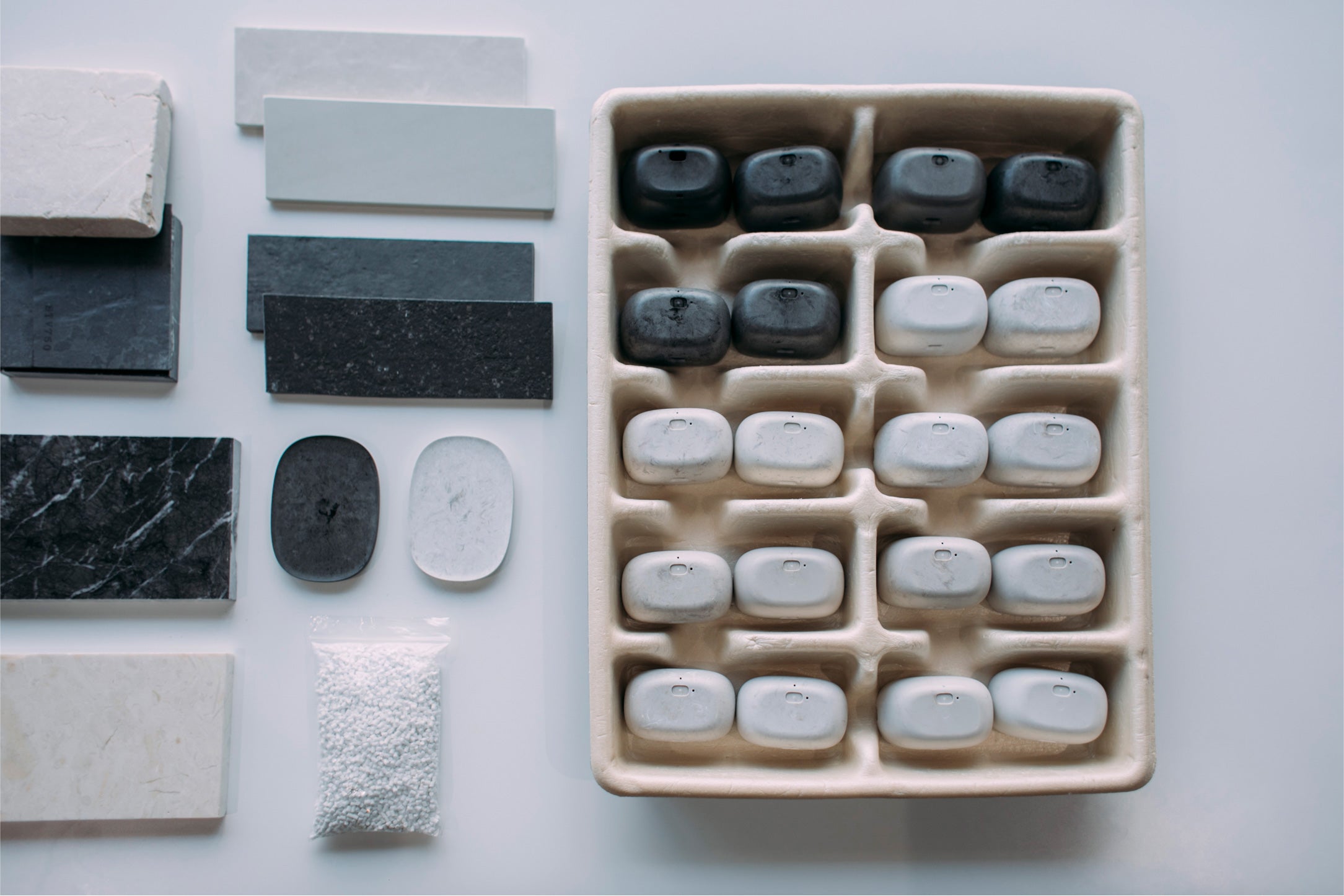 nature—reminiscent of a stone that naturally fits into any setting, from a washing basin to a work desk. Their goal was to create a product with a tactile balance that feels both soft and icy. While carving marble initially seemed the ideal approach, artificial marble proved too difficult to process and prohibitively expensive. This challenge led them to explore various resins