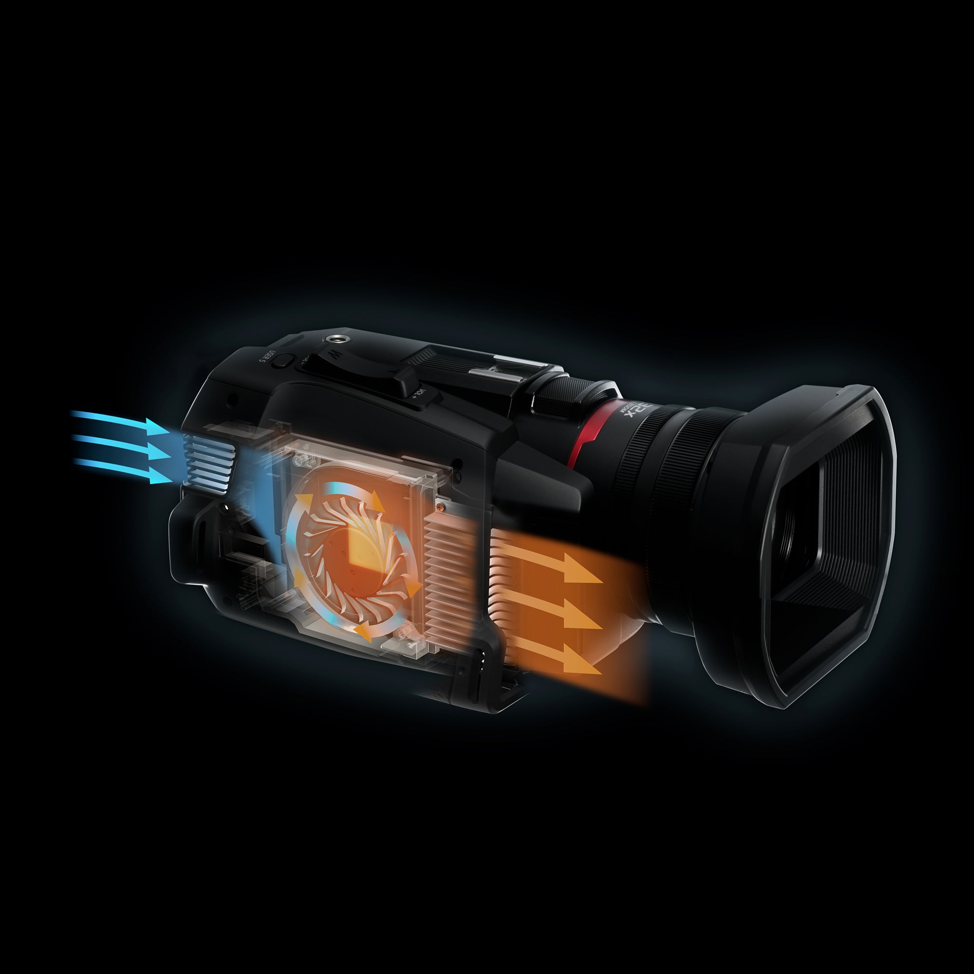 The heat dispersion structure equipped with an ultrathin fan enables a compact, lightweight body to be combined with ultra high definition 4K 60p recording.