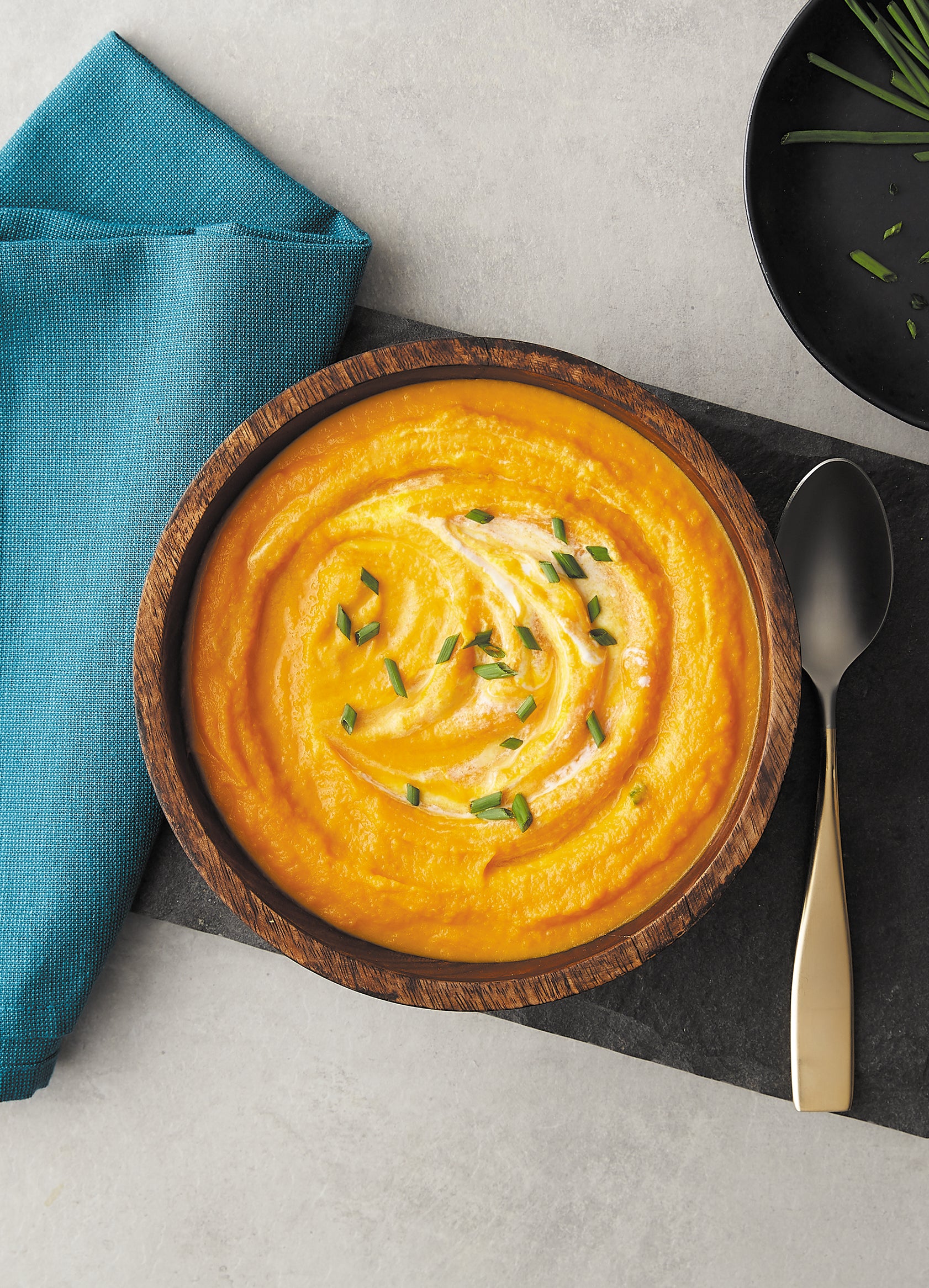 Here’s a total orange delight. Fresh-squeezed orange juice gently enhances the natural sweetness of carrots and onions. It’s rich and satisfying in flavor and vitamins, and so beguilingly tasty the kids will love it too.