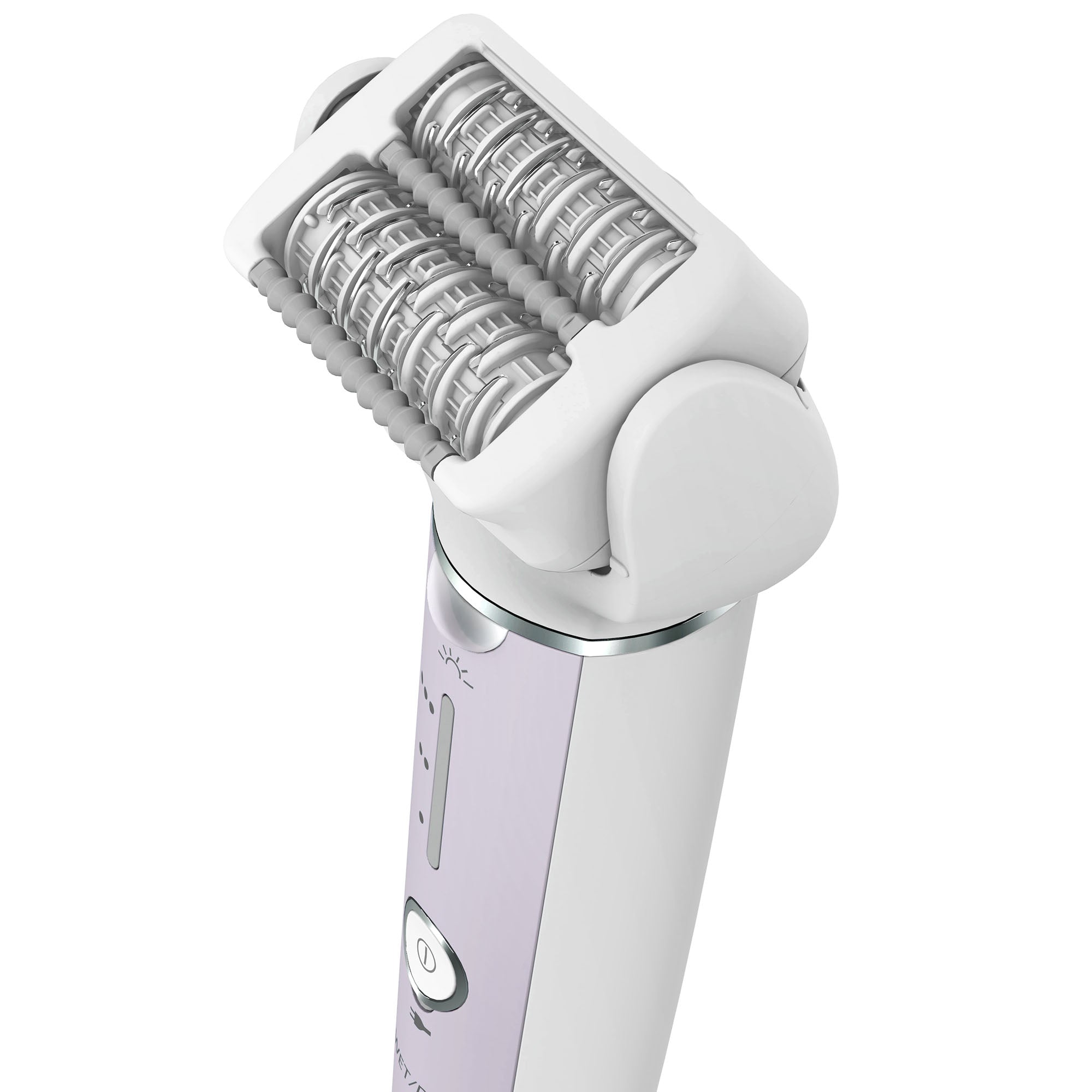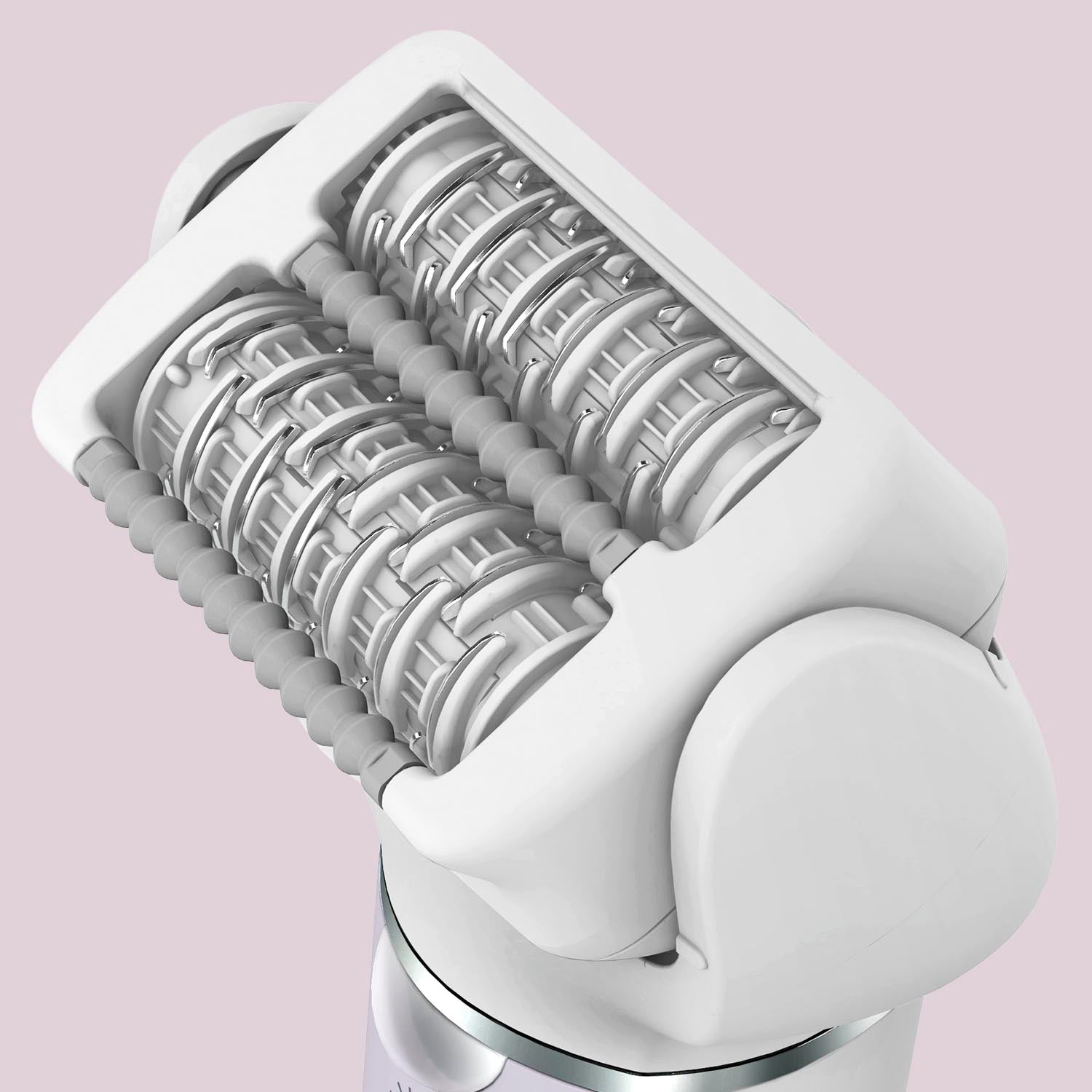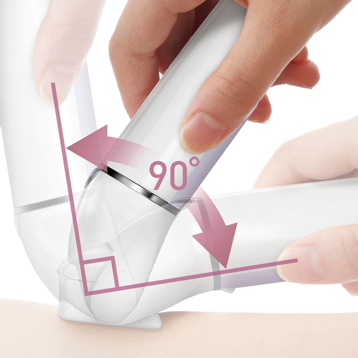 - For hard to reach areas, a 90 degree pivoting epilator head closely moves along the contours of your body; a cordless design makes it easy to use the epilator anytime, anywhere