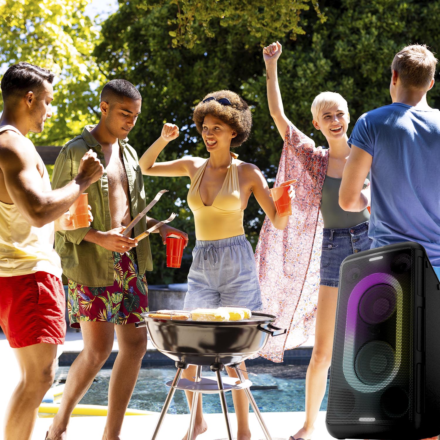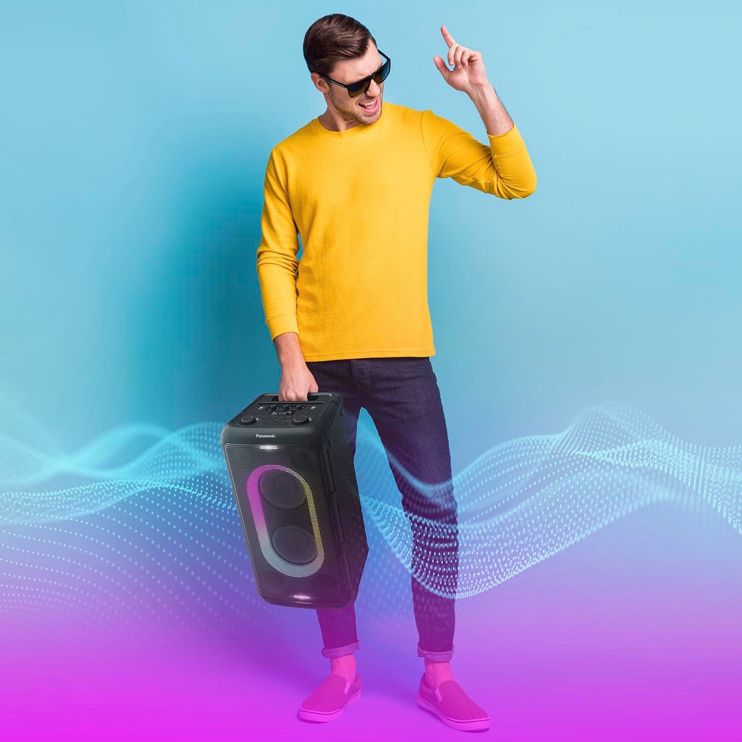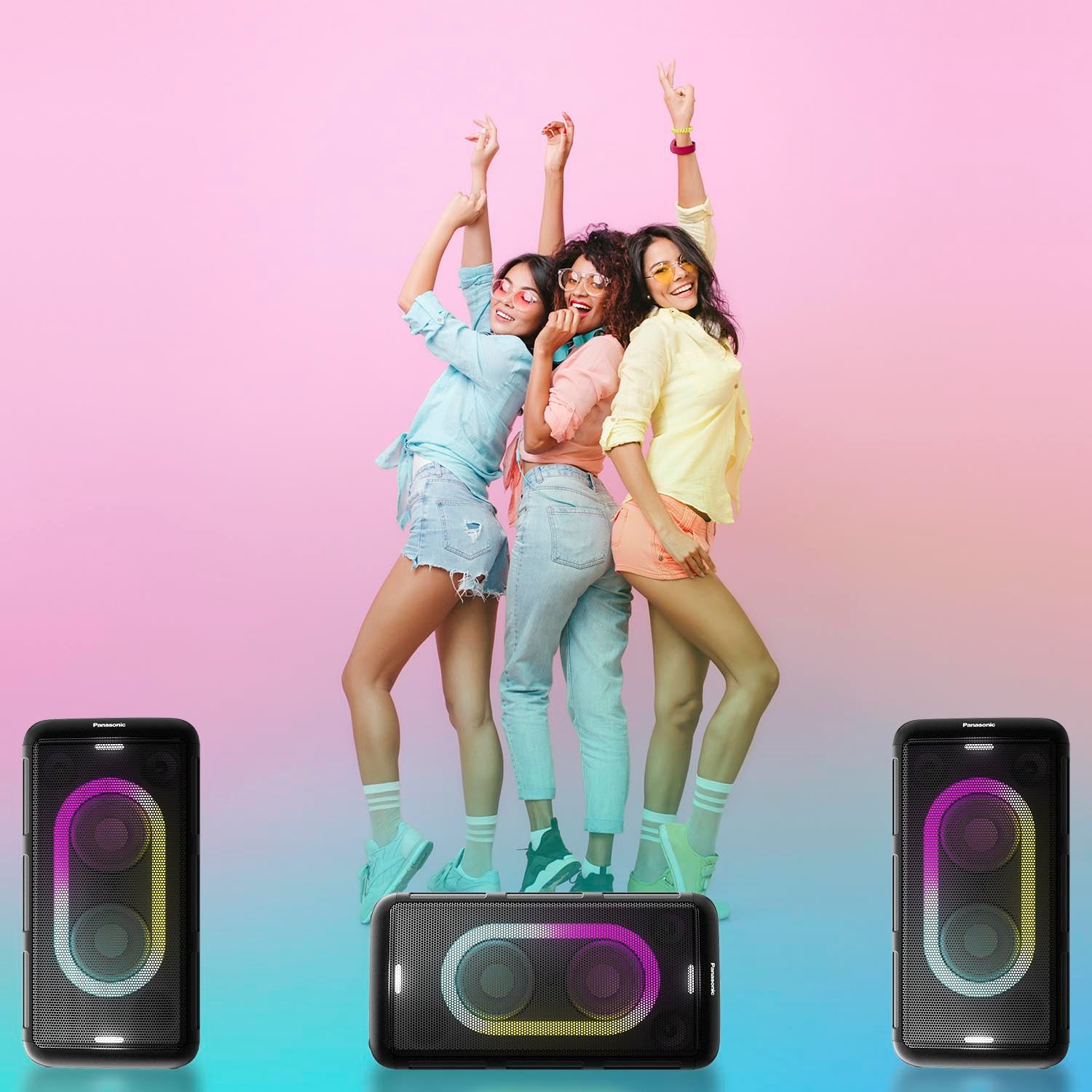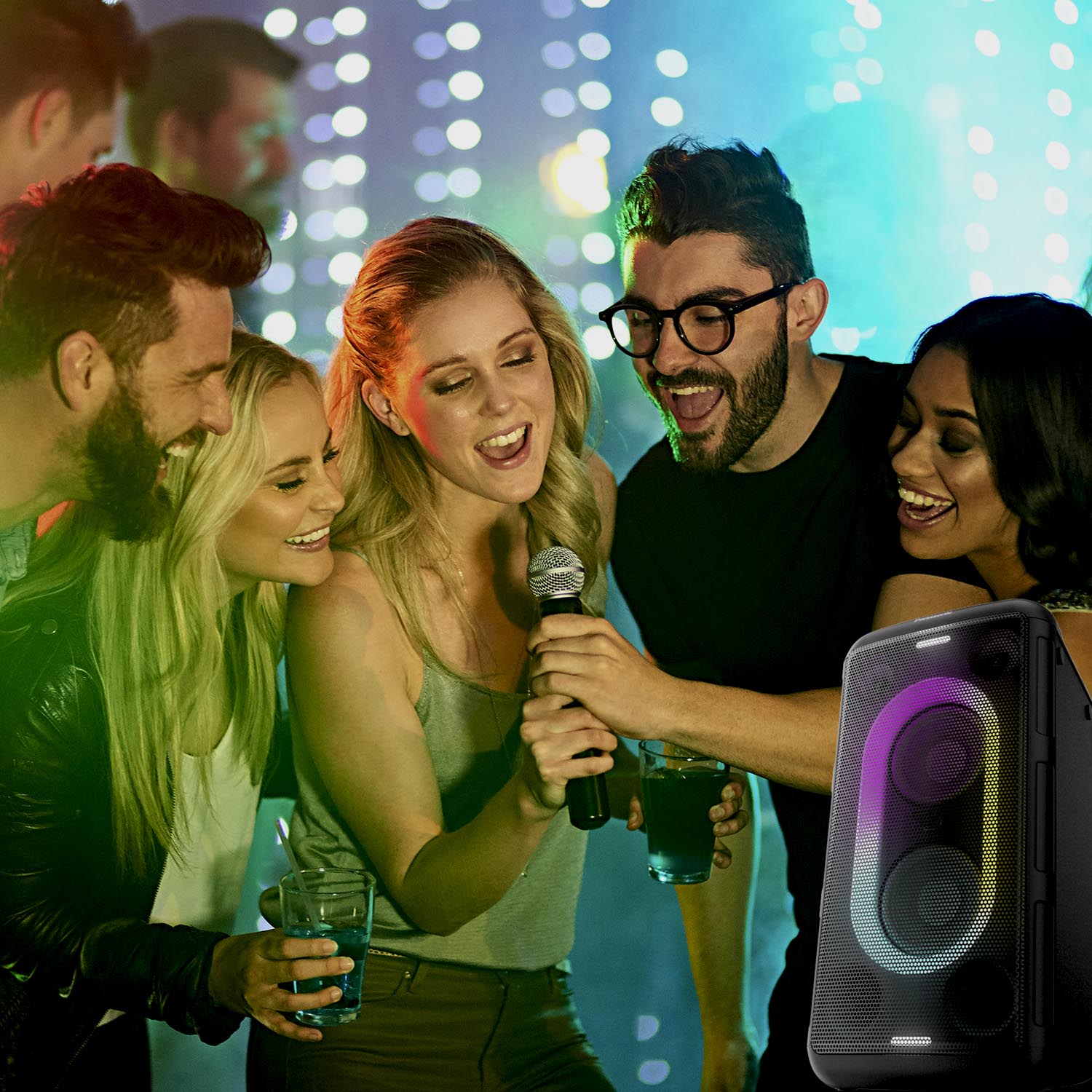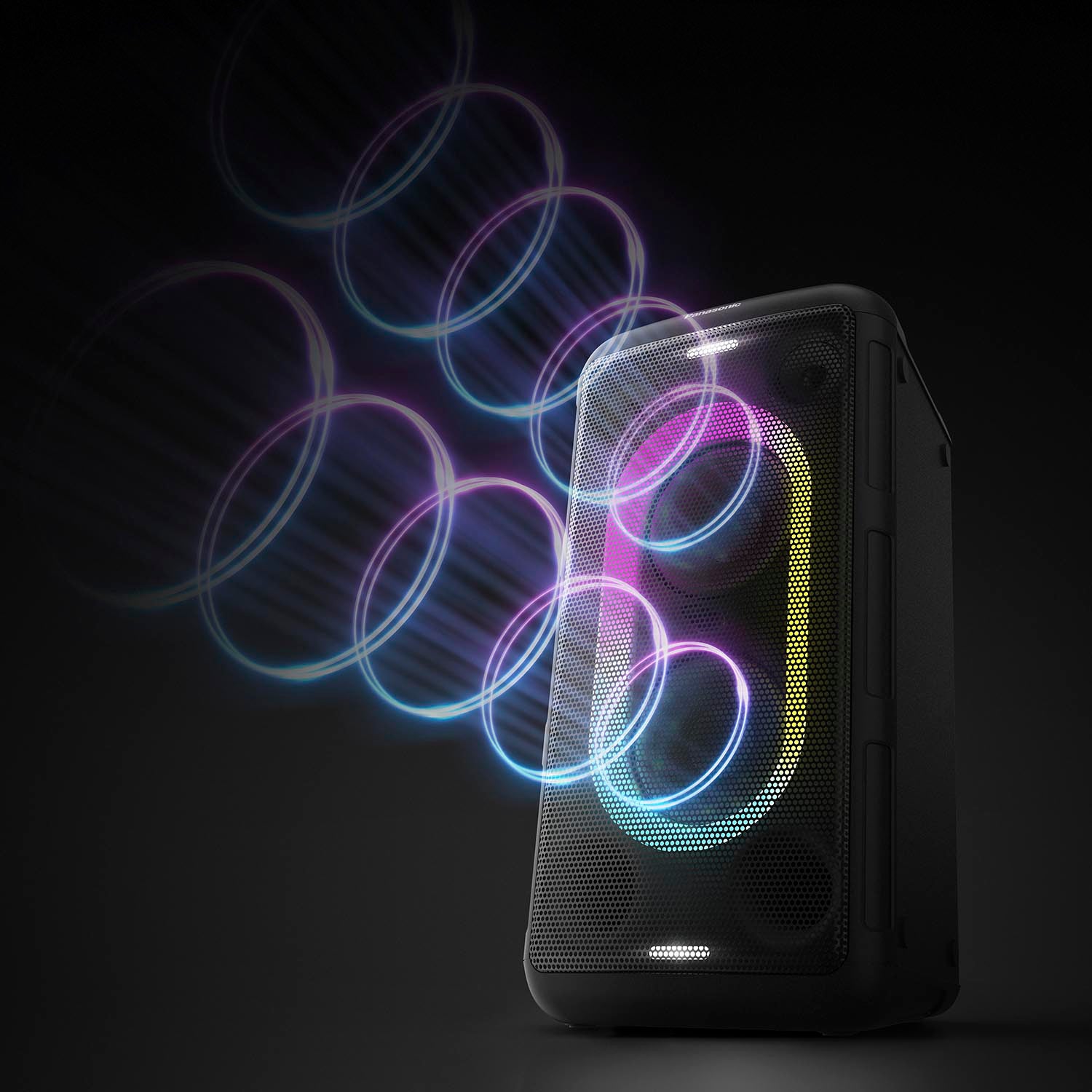 - Featuring 14cm woofers, tweeters, and bass reflex ports, this partybox delivers 150W of rich, powerful sound; with multicolor lighting and Bass Boost for deep lows, it’s perfect for music lovers and party vibes
