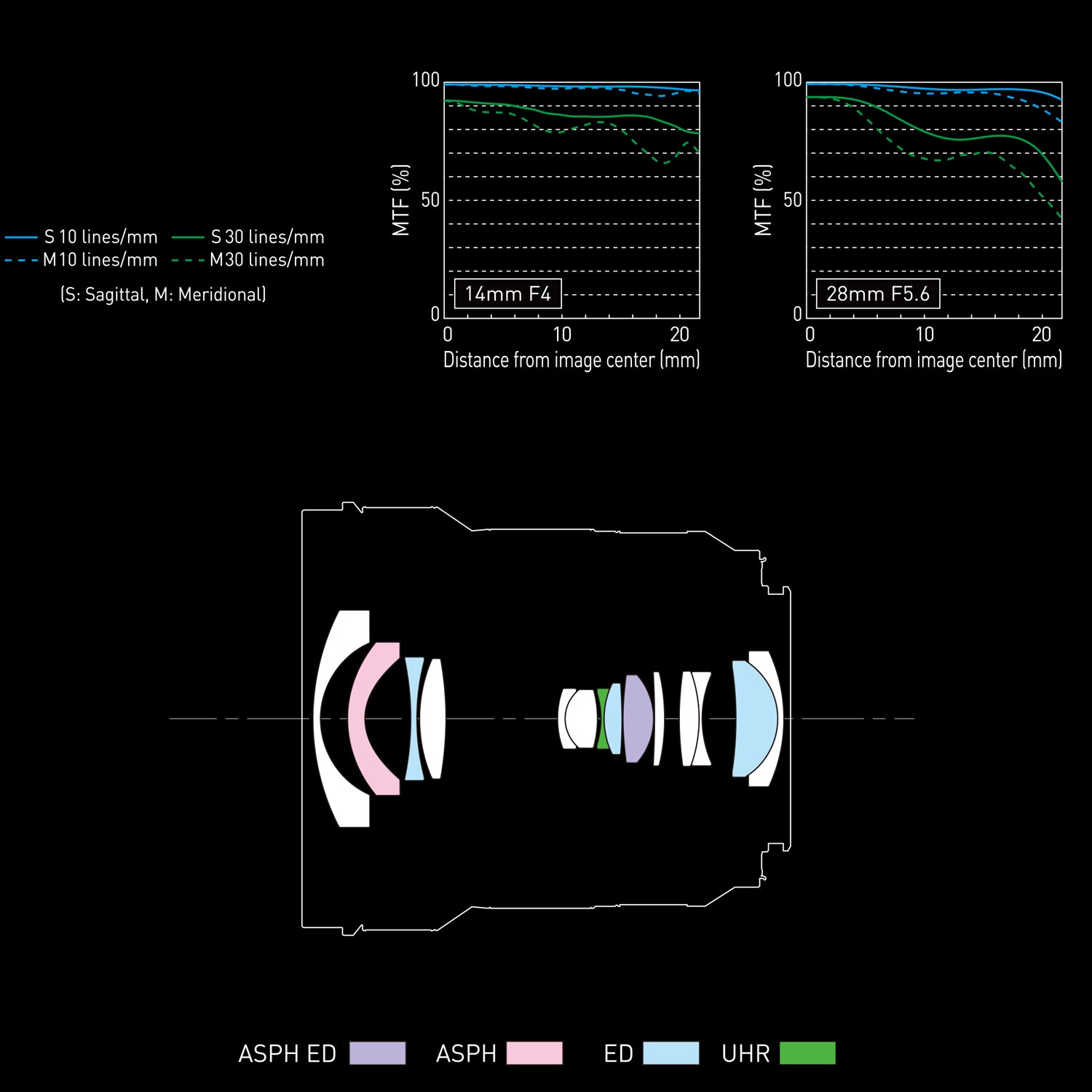 - S-R1428 is comprised of 14 lens elements in 10 groups with the use of aspherical lenses and 2 ED lenses to suppress chromatic aberration
