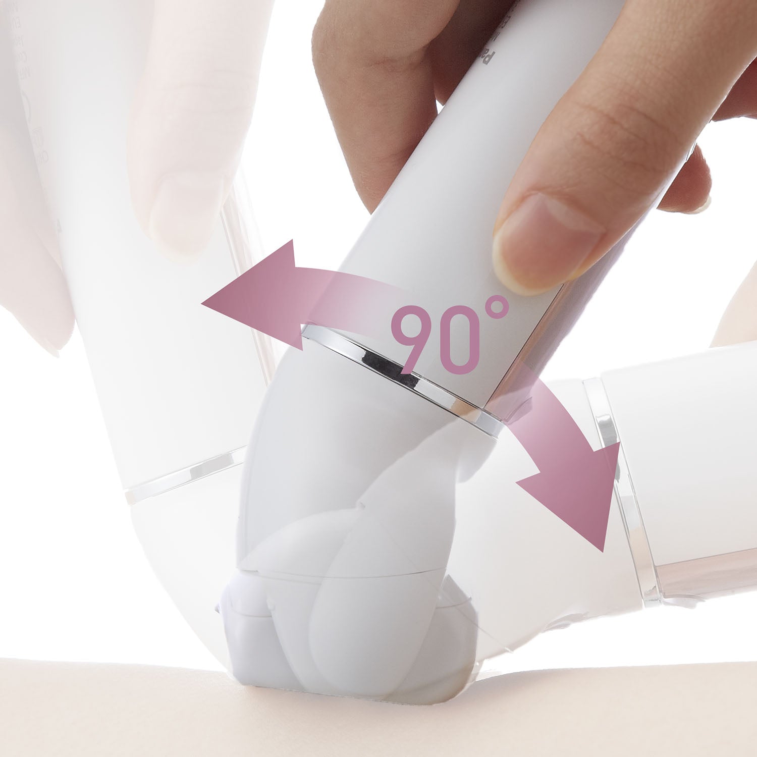 - For hard to reach areas, a 90 degree pivoting epilator head closely moves along the contours of your body; a cordless design makes it easy to use the epilator anytime, anywhere